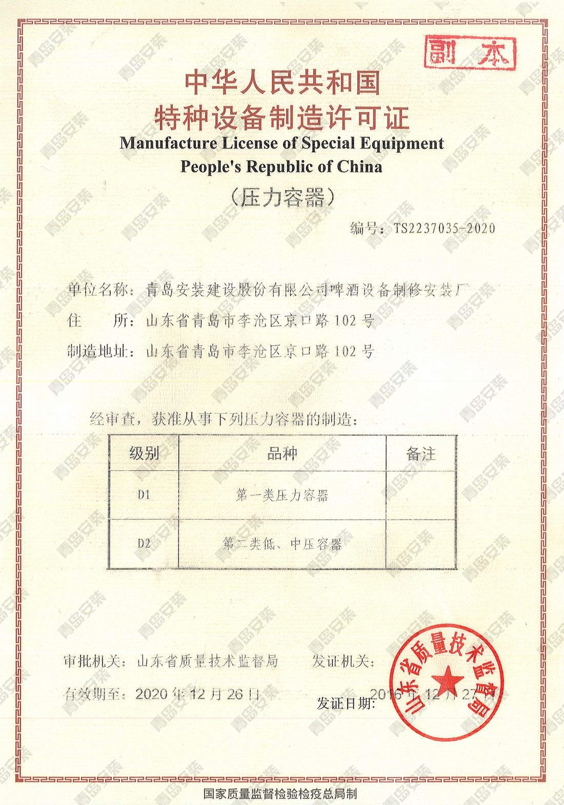 特種設(shè)備安裝改造維修許可證-壓力容器