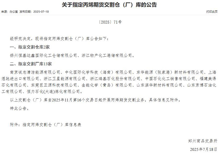 7月18日,東莞巨正源科技有限公司繼成為大連商品交易所(以下簡稱“大商所”)聚丙烯期貨指定廠庫后,憑借在化工領域的專業實力與產業協同,成功通過鄭州商品交易所(以下簡稱“鄭商所”)的嚴格評審,正式成為鄭商所丙烯期貨指定廠庫。