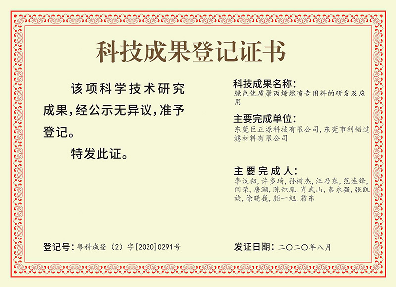 近日,巨正源科技公司“綠色優(yōu)質(zhì)聚丙烯熔噴專用料的研發(fā)及應(yīng)用”項(xiàng)目順利通過科技成果登記(登記號(hào):粵科成登(2)字[2020]0291號(hào))。這是巨正源科技公司堅(jiān)持創(chuàng)新驅(qū)動(dòng)發(fā)展、推進(jìn)科技成果轉(zhuǎn)化結(jié)出的又一碩果。